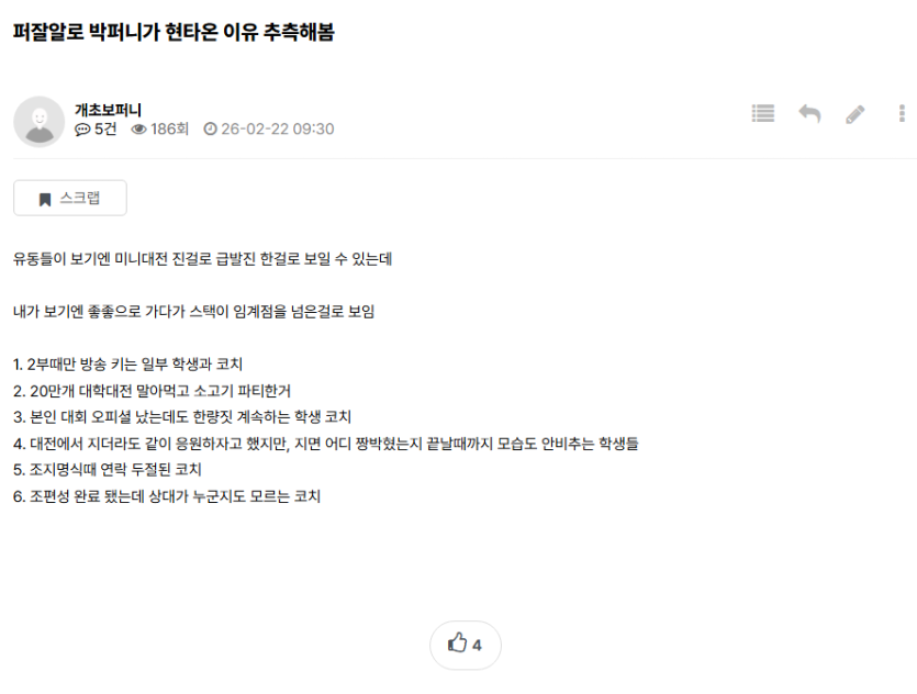 퍼잘알님.. 퍼니가 다시 믿고 어쩌고 하는데;; 설마 대회후에 아무런 변화도 안주고 이대로 가보자고 결심한걸로 보이나요?