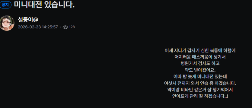 - 이전글퍼니형 6시 정각에 엔트리 올린거 좋았다 26.02.23