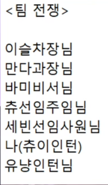 어제 츄이님 퇴근방송 봤는데 팀전 팀원 발표하던데요